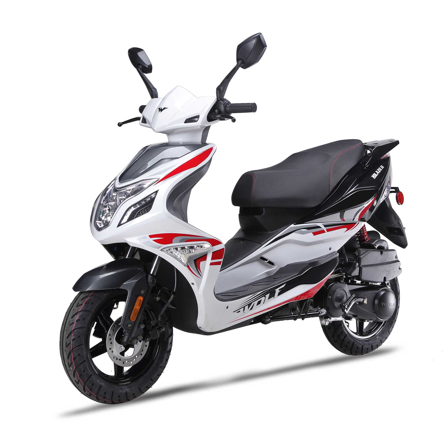 You’ve never seen anything like it before! Comes in sporty white with carbon fiber trimming, red accents on the caliper and shock, and ultra-cool graphics to complete this super sporty scooter. This model comes with an upgraded Performance Carburetor, Motobatt Battery, LED Headlights, Duro Tires, and a NGK Spark Plug! You’ll be fully covered and ready to hit the streets with this bad boy!