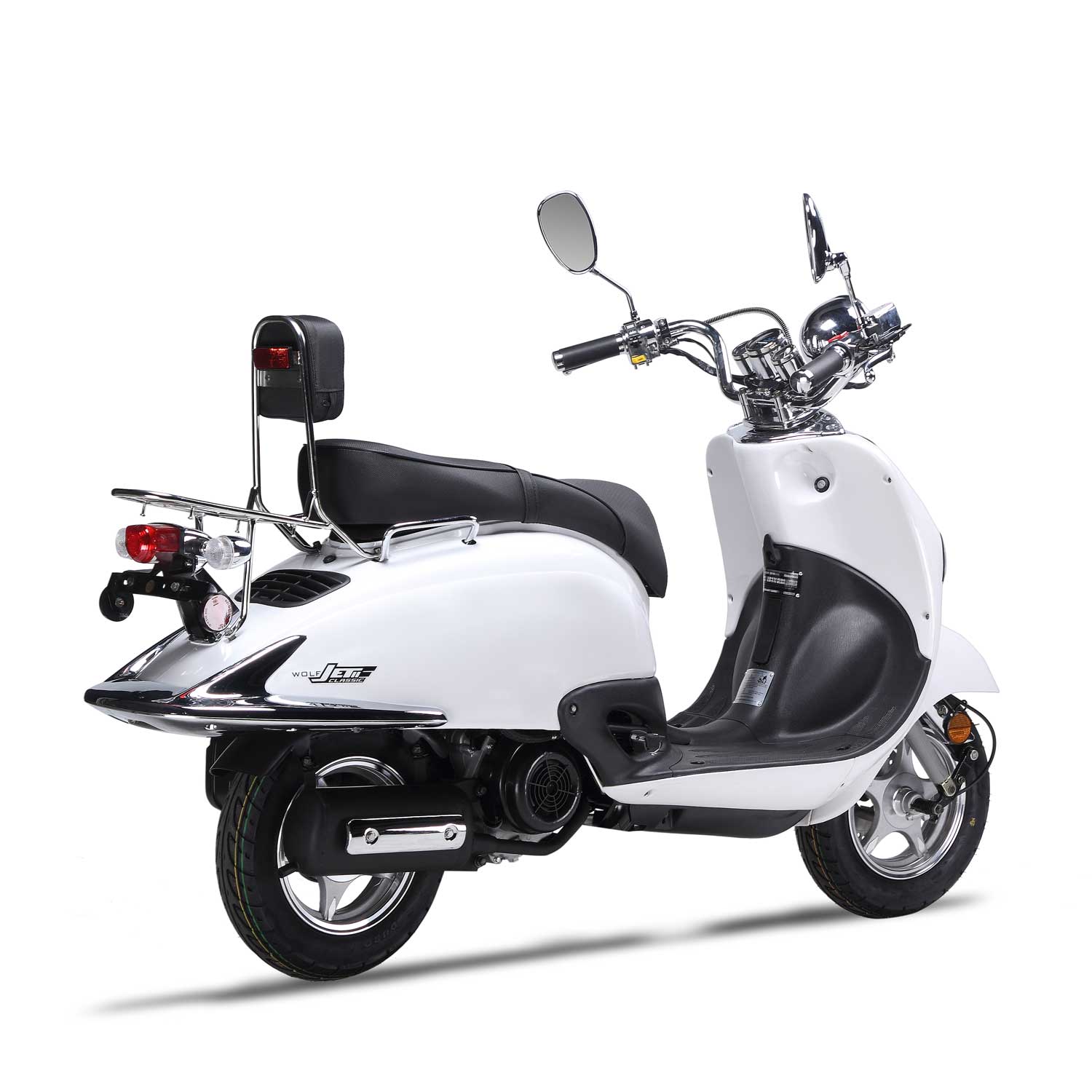 The Wolf Jet Classic II is one sweet ride! Retro styling, smooth riding, and plenty of room for a passenger, this scooter has it all! Featuring a 150cc 4-stroke engine this classic is anything but slow! Getting 80-90 MPG you’ll be looking’ good and saving money! Also available in a 50cc, the Jet Classic.