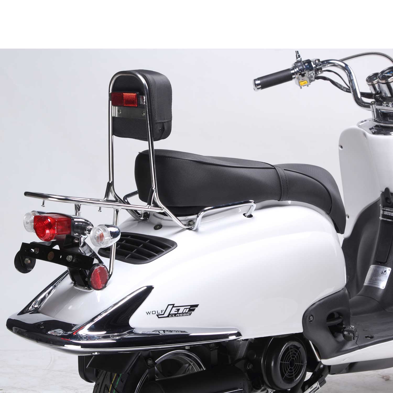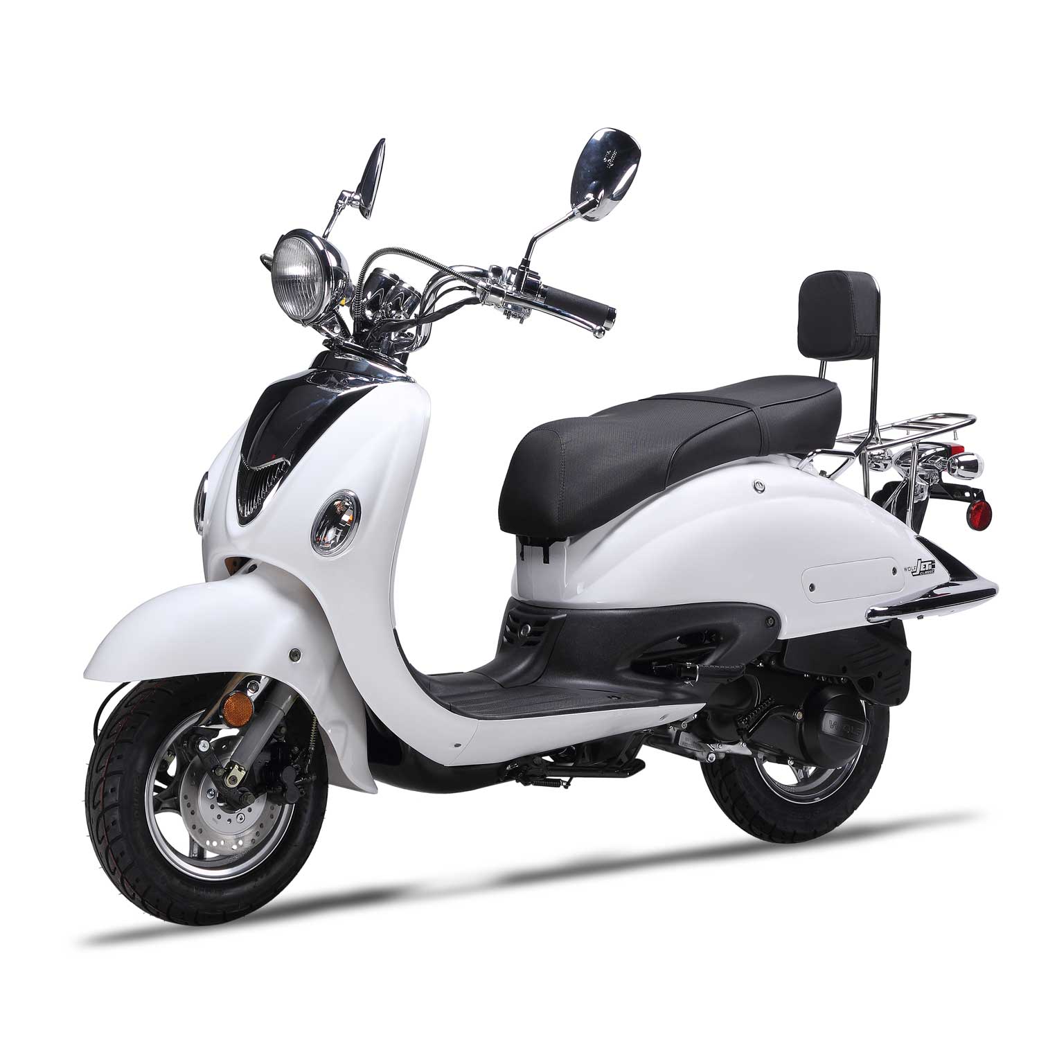 The Wolf Jet Classic II is one sweet ride! Retro styling, smooth riding, and plenty of room for a passenger, this scooter has it all! Featuring a 150cc 4-stroke engine this classic is anything but slow! Getting 80-90 MPG you’ll be looking’ good and saving money! Also available in a 50cc, the Jet Classic.